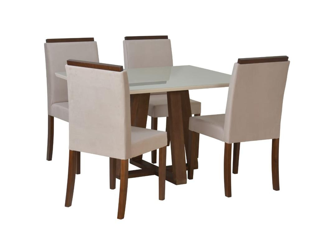 Adquira a sua Sala de Jantar Zafira hoje e eleve o nível de elegância e conforto em sua casa. Desfrute de refeições memoráveis e encontros especiais com este conjunto sofisticado e funcional. Transforme seu espaço em um ambiente acolhedor e elegante com a Sala de Jantar Zafira de 4 cadeiras estofadas e mesa de tampo de vidro pintado e pé central.